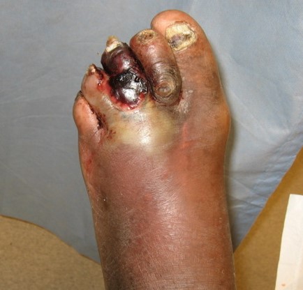 A 64 years old male presenting to A&E with fever and general unwellness. His wife describes that he has been having worsening Lt foot pain for the last 3 days and started to become smelly on the day before.